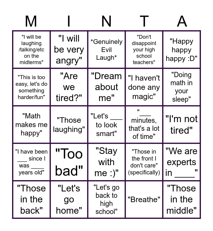 This bingo card has 25 words: "Too bad", "Let's go back to high school", "Dream about me", "Those in the back", "Happy happy happy :D", "I will be laughing /talking/etc on the midterms", "This is too easy, let's do something harder/fun", "I will be very angry", "___ minutes, that's a lot of time", "Stay with me :)", "I haven't done any magic", "Math makes me happy", "Those in the front I don't care" (specifically), "We are experts in ____", "Are we tired?", "Those in the middle", "I'm not tired", *Genuinely Evil Laugh*, "Doing math in your sleep", "Those laughing", "Let's ___ to look smart", "Let's go home", "I have been ___ since I was ____ years old", "Don't disappoint your high school teachers" and "Breathe".