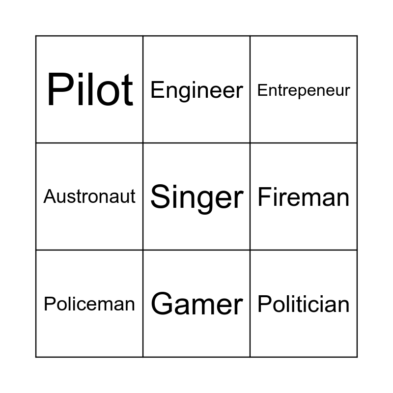 This bingo card has a free space and 8 words: Fireman, Entrepeneur, Engineer, Policeman, Pilot, Politician, Austronaut and Gamer.