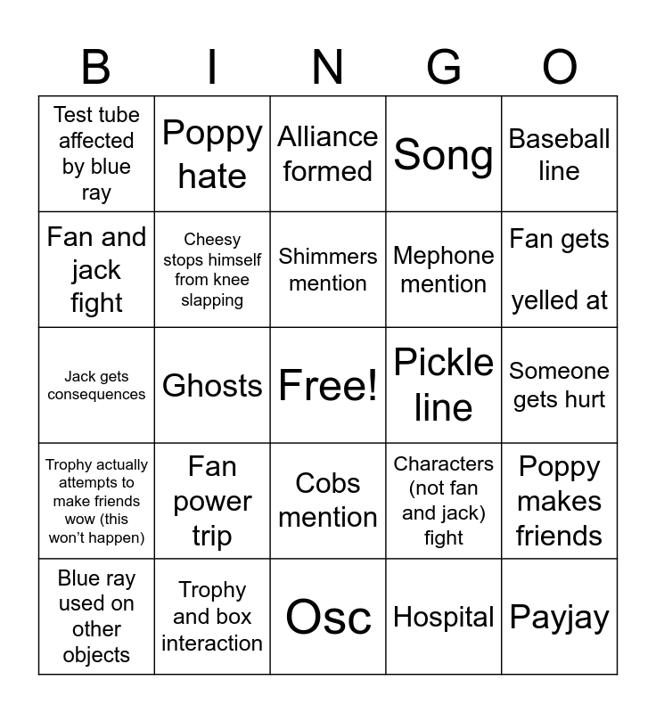 This bingo card has a free space and 24 words: Fan power trip, Trophy and box interaction, Shimmers mention, Blue ray used on other objects, Baseball line, Test tube affected by blue ray, Fan and jack fight, Poppy hate, Pickle line, Cobs mention, Mephone mention, Jack gets consequences, Characters (not fan and jack) fight, Poppy makes friends, Cheesy stops himself from knee slapping, Hospital, Someone gets hurt, Alliance formed, Fan gets yelled at, Ghosts, Payjay, Trophy actually attempts to make friends wow (this won’t happen), Song and Osc.