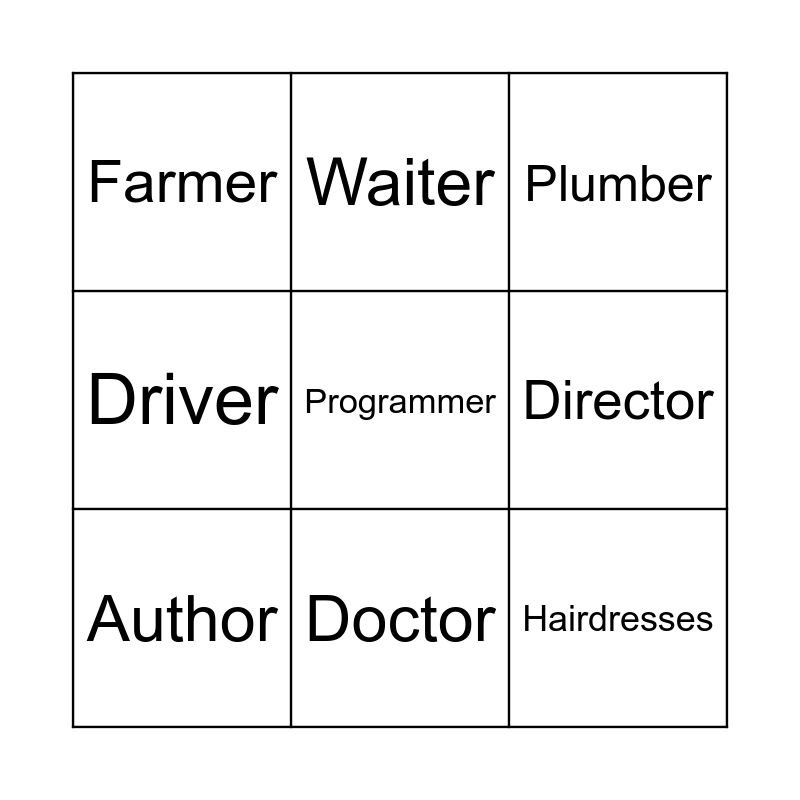 This bingo card has a free space and 8 words: Director, Plumber, Waiter, Author, Farmer, Hairdresses, Driver and Doctor.