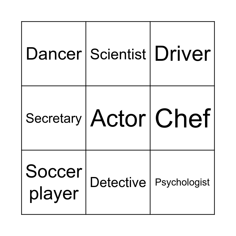 This bingo card has a free space and 8 words: Chef, Driver, Scientist, Soccer player, Dancer, Psychologist, Secretary and Detective.
