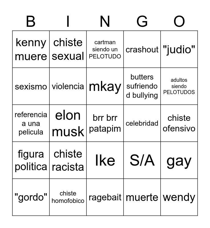 This bingo card has a free space and 24 words: chiste racista, chiste homofobico, mkay, "gordo", "judio", kenny muere, sexismo, chiste sexual, celebridad, Ike, butters sufriendo d bullying, referencia a una pelicula, S/A, gay, violencia, muerte, chiste ofensivo, cartman siendo un PELOTUDO, adultos siendo PELOTUDOS, elon musk, wendy, figura politica, crashout and ragebait.