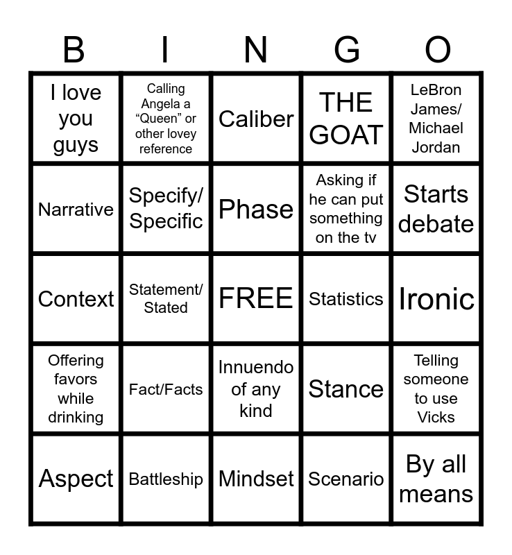 This bingo card has a free space and 29 words: Aspect, Time frame, Statement/ Stated, Jest, I love you guys, Caliber, Specify/ Specific, Fact/Facts, Statistics, Battleship, Ironic, By all means, Mindset, Scenario, Starts debate, Asking someone to bring him a beer, Innuendo of any kind, Offering favors while drinking, LeBron James/ Michael Jordan, Context, Stance, Misses trash can, Asking if he can put something on the tv, Narrative, THE GOAT, Calling Angela a “Queen” or other lovey reference, Telling someone to use Vicks, Phase and Says he doesn’t want a shot, takes one anyways.