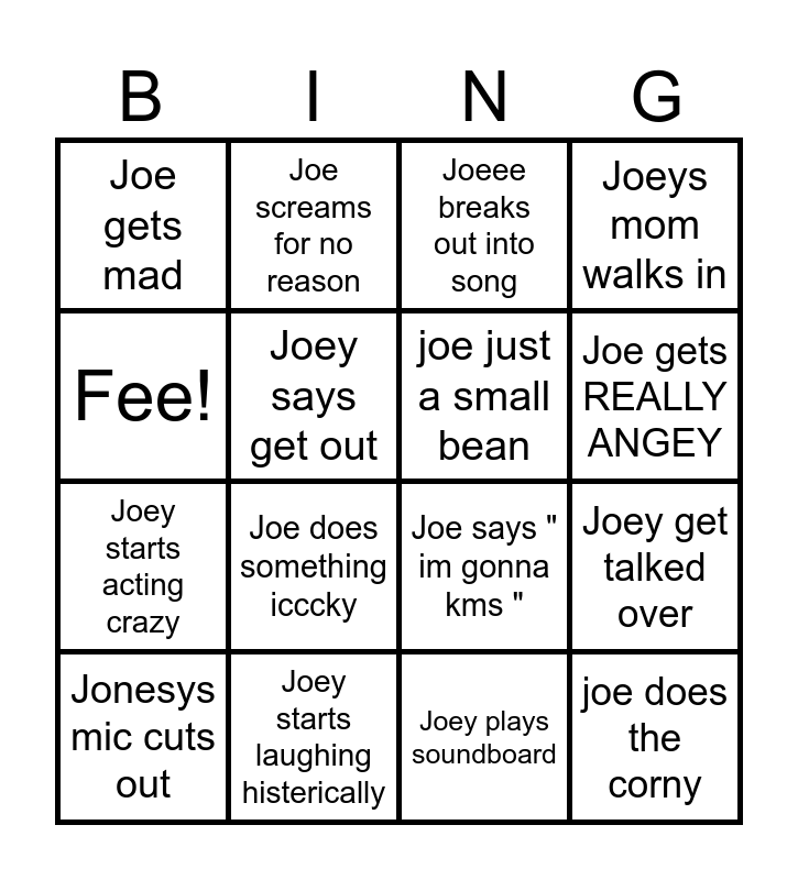This bingo card has 16 words: Joey starts laughing histerically, Joey get talked over, Joeee breaks out into song, Joe gets mad, Joey starts acting crazy, Joe screams for no reason, Joe says " im gonna kms ", Joey plays soundboard, Fee!, Joey says get out, Jonesys mic cuts out, Joeys mom walks in, Joe does something icccky, Joe gets REALLY ANGEY, joe just a small bean and joe does the corny.