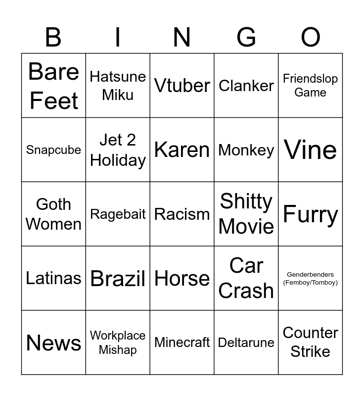 This bingo card has a free space and 24 words: Brazil, Workplace Mishap, Karen, News, Friendslop Game, Bare Feet, Snapcube, Hatsune Miku, Shitty Movie, Horse, Monkey, Goth Women, Car Crash, Genderbenders (Femboy/Tomboy), Jet 2 Holiday, Deltarune, Furry, Vtuber, Vine, Ragebait, Counter Strike, Latinas, Clanker and Minecraft.