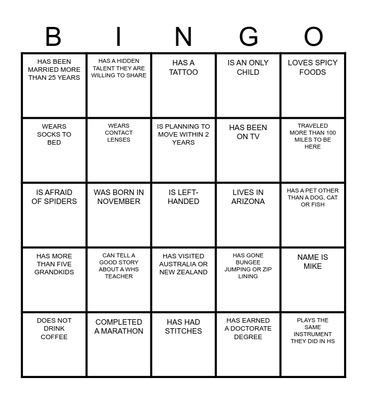 This bingo card has a free space and 24 words: CAN TELL A GOOD STORY ABOUT A WHS TEACHER, COMPLETED A MARATHON, IS PLANNING TO MOVE WITHIN 2 YEARS, DOES NOT DRINK COFFEE, LOVES SPICY FOODS, HAS BEEN MARRIED MORE THAN 25 YEARS, WEARS SOCKS TO BED, HAS A HIDDEN TALENT THEY ARE WILLING TO SHARE, LIVES IN ARIZONA, HAS VISITED AUSTRALIA OR NEW ZEALAND, HAS BEEN ON TV, IS AFRAID OF SPIDERS, HAS GONE BUNGEE JUMPING OR ZIP LINING, NAME IS MIKE, WEARS CONTACT LENSES, HAS EARNED A DOCTORATE DEGREE, HAS A PET OTHER THAN A DOG, CAT OR FISH, HAS A TATTOO, TRAVELED MORE THAN 100 MILES TO BE HERE, WAS BORN IN NOVEMBER, PLAYS THE SAME INSTRUMENT THEY DID IN HS, HAS MORE THAN FIVE GRANDKIDS, IS AN ONLY CHILD and HAS HAD STITCHES.
