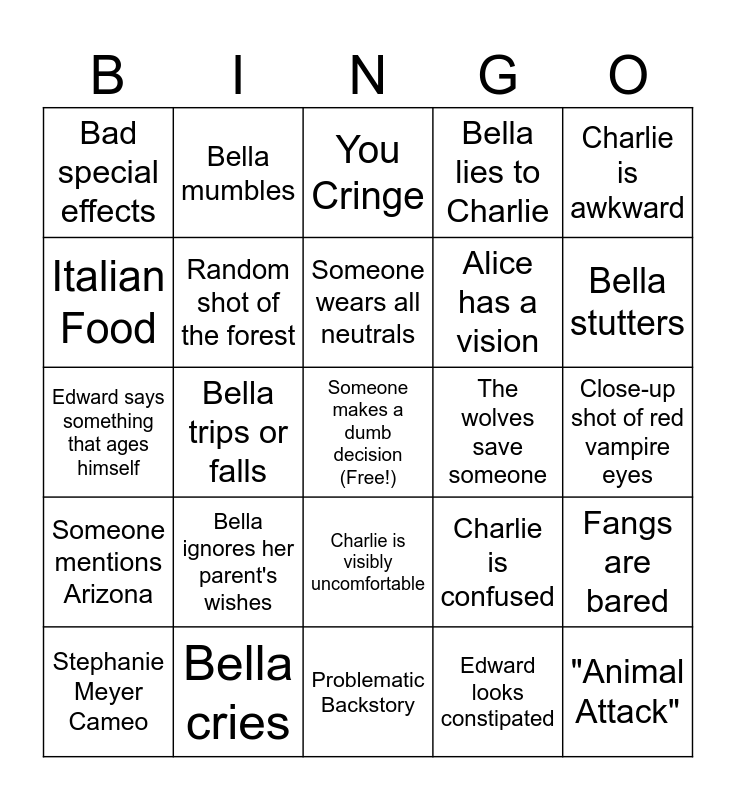 This bingo card has a free space and 61 words: Jacob is actually wearing a shirt, Bella cries, Unnecessary heavy breathing, Someone mentions Arizona, Edward looks constipated, Rain, Random shot of the forest, Vampire mega jump, Alice has a vision, Emo Breakdown, Bella lies to Charlie, Edward smirks, Italian Food, Rosalie is snarky, Religious symbol or iconography, Bad special effects, "Animal Attack", Charlie is awkward, Bella is compared to food, Someone wears all neutrals, The wolves save someone, You Cringe, Stephanie Meyer Cameo, Fangs are bared, Bella injures herself, Edward invades Bella's privacy, Edward holds his breath, Obvious Wig, Bella stutters, Edward glares, Pale face makeup does not match neck, Bella tucks her hair behind her ear, Bella bites her lip, Bella does a voiceover, Bella mumbles, Sparkly Skin, Pompadour, Bella trips or falls, Vampire speed running, Edward says something that ages himself, Rosalie has RBF, Bella ignores her parent's wishes, Close-up shot of red vampire eyes, Bella almost dies, Charlie is confused, "Vegetarian", The Meadow, You want to call CPS, Edward kisses Bella like a dead fish, Charlie is visibly uncomfortable, Problematic Backstory, Jacob cries, Edward is dramatic, Jacob or Edward carries Bella, Overexaggerated Sniffing, Dramatic and angsty montage, Charlie grumbles, Jasper looks at Bella like she is a piece of meat, Jacob is unnecessarily shirtless, Iconic song plays and Weird Filter.