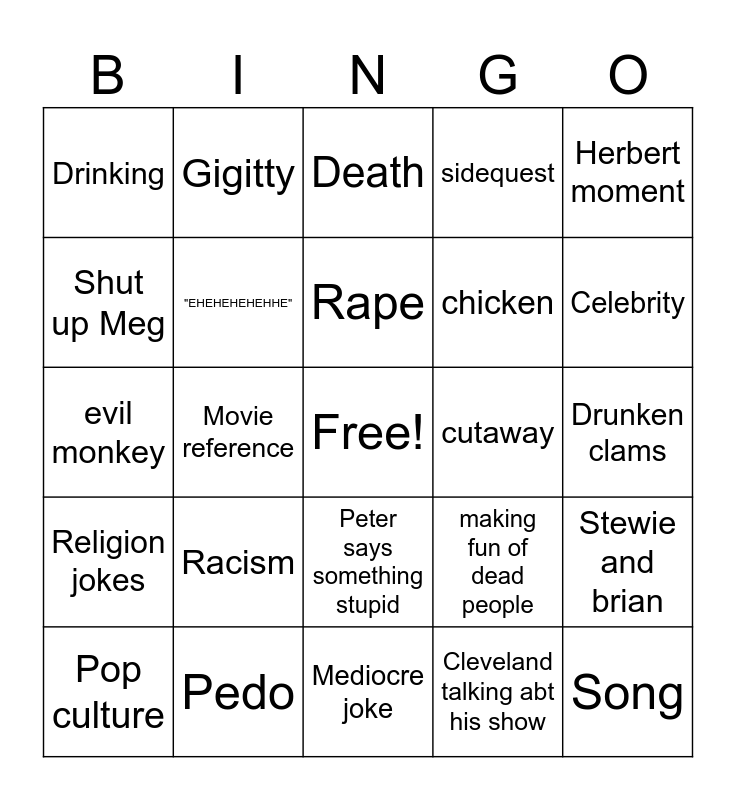 This bingo card has a free space and 24 words: Racism, Pedo, Rape, Pop culture, Herbert moment, Drinking, Shut up Meg, Gigitty, cutaway, Peter says something stupid, chicken, evil monkey, making fun of dead people, Stewie and brian, "EHEHEHEHEHHE", Cleveland talking abt his show, Drunken clams, Death, Celebrity, Movie reference, Song, Religion jokes, sidequest and Mediocre joke.