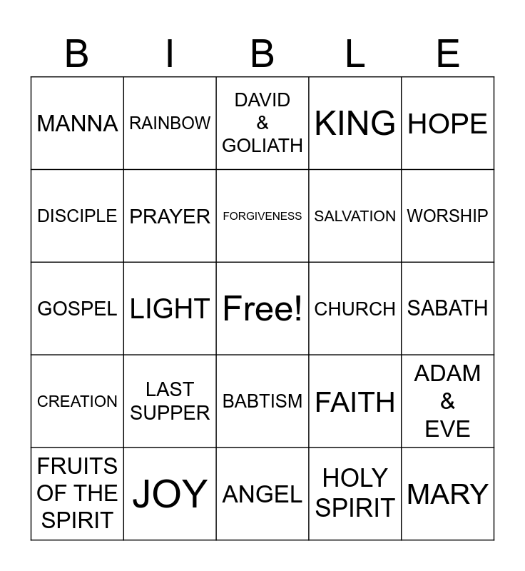 This bingo card has a free space and 36 words: BIBLE, JESUS, LOVE, PRAYER, FAITH, CREATION, FORGIVENESS, HEAVEN, HOPE, CROSS, LIGHT, KING, ARK, CHURCH, WORSHIP, MANNA, RESURRECTION, LAST SUPPER, MARY, DAVID & GOLIATH, SABATH, ADAM & EVE, JOY, FRUITS OF THE SPIRIT, ANGEL, RAINBOW, GOSPEL, GRACE, SALVATION, DISCIPLE, SIN, TESTIMONY, HOLY SPIRIT, BABTISM, DARKNESS and VERSE.