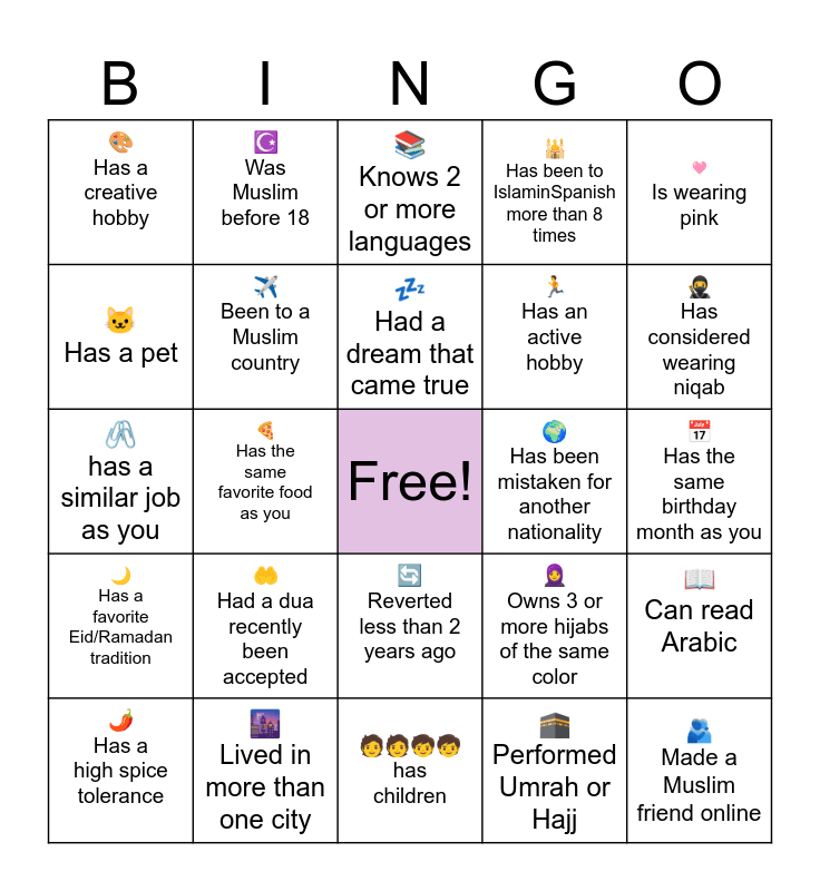 This bingo card has a free space and 24 words: 🤲 Had a dua recently been accepted, 🌆 Lived in more than one city, 💤 Had a dream that came true, 🌶️ Has a high spice tolerance, 🩷 Is wearing pink, 🎨 Has a creative hobby, 🐱 Has a pet, ☪️ Was Muslim before 18, 🌍 Has been mistaken for another nationality, 🔄 Reverted less than 2 years ago, 🏃 Has an active hobby, 🖇️ has a similar job as you, 🧕 Owns 3 or more hijabs of the same color, 📖 Can read Arabic, ✈️ Been to a Muslim country, 🕋 Performed Umrah or Hajj, 📅 Has the same birthday month as you, 📚 Knows 2 or more languages, 🥷 Has considered wearing niqab, 🍕 Has the same favorite food as you, 🫂 Made a Muslim friend online, 🌙 Has a favorite Eid/Ramadan tradition, 🕌 Has been to IslaminSpanish more than 8 times and 🧑🧑🧒🧒 has children.