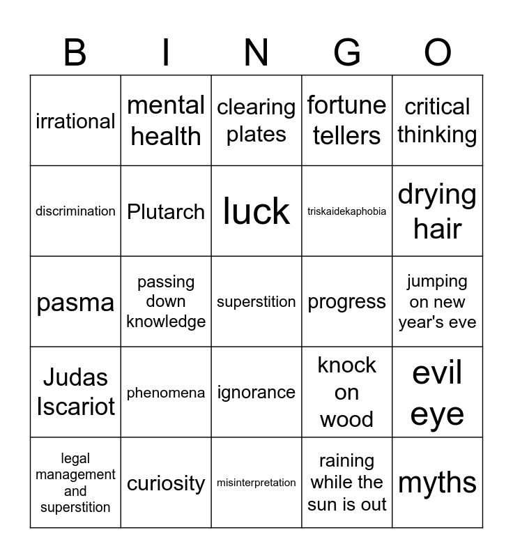 This bingo card has a free space and 24 words: phenomena, curiosity, luck, legal management and superstition, critical thinking, irrational, discrimination, mental health, progress, ignorance, triskaidekaphobia, pasma, knock on wood, evil eye, Plutarch, raining while the sun is out, jumping on new year's eve, clearing plates, drying hair, passing down knowledge, myths, Judas Iscariot, fortune tellers and misinterpretation.