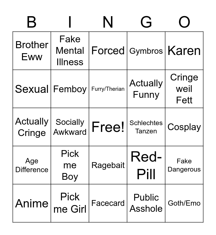 This bingo card has a free space and 24 words: Pick me Boy, Pick me Girl, Furry/Therian, Anime, Karen, Brother Eww, Sexual, Fake Mental Illness, Schlechtes Tanzen, Ragebait, Actually Funny, Actually Cringe, Red-Pill, Fake Dangerous, Femboy, Public Asshole, Cosplay, Forced, Cringe weil Fett, Socially Awkward, Goth/Emo, Age Difference, Gymbros and Facecard.