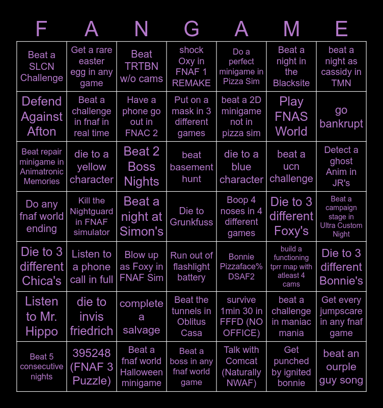 This bingo card has a free space and 63 words: Beat 5 consecutive nights, die to invis friedrich, freeze in ONAF 3, Beat a boss in any fnaf world game, die to a blue character, beat a challenge in maniac mania, beat a night as cassidy in TMN, Complete an order in ABaF, die to a yellow character, complete a salvage, beat basement hunt, survive 1min 30 in FFFD (NO OFFICE), beat a ucn challenge, go bankrupt, Listen to Mr. Hippo, Beat a challenge in fnaf in real time, Beat TRTBN w/o cams, shock Oxy in FNAF 1 REMAKE, Do markiplier easter egg in fnac, Play FNAS World, Beat a campaign stage in Ultra Custom Night, Do any fnaf world ending, Get a rare easter egg in any game, Have a phone go out in FNAC 2, Power Outage, build a functioning tprr map with atleast 4 cams, beat an ourple guy song, Die to 3 different Freddy's, Listen to a phone call in full, Beat a night at Simon's, Beat FNAF Quiz by IronCrafter22 on Happy Wheels, Bonnie Pizzaface% DSAF2, Get punched by ignited bonnie, Get a Golden Sonic in FNAS, Defend Against Afton, Kill the Nightguard in FNAF simulator, Blow up as Foxy in FNAF Sim, Beat the tunnels in Oblitus Casa, Boop 4 noses in 4 different games, Beat a night in the Blacksite, Detect a ghost Anim in JR's, Beat repair minigame in Animatronic Memories, Use Cam flash on Chica in Freddy's Reanimated, Beat a Max Mode, Put on a mask in 3 different games, Do a perfect minigame in Pizza Sim, Die to 3 different Foxy's, Die to 3 different Bonnie's, Die to 3 different Chica's, Deathcoin an Anim in UCN, Beat a fnaf world Halloween minigame, Run out of flashlight battery, beat a 2D minigame not in pizza sim, Kill the nightguard in Chica Simulator, Listen to the whole tape in FNAC 3, Beat a SLCN Challenge, 395248 (FNAF 3 Puzzle), Beat 2 Boss Nights, Beat a fnaf 2 CN challenge, Talk with Comcat (Naturally NWAF), get rid of 3 freddles on the bed, Get every jumpscare in any fnaf game and Watch 1 markiplier fnaf video.