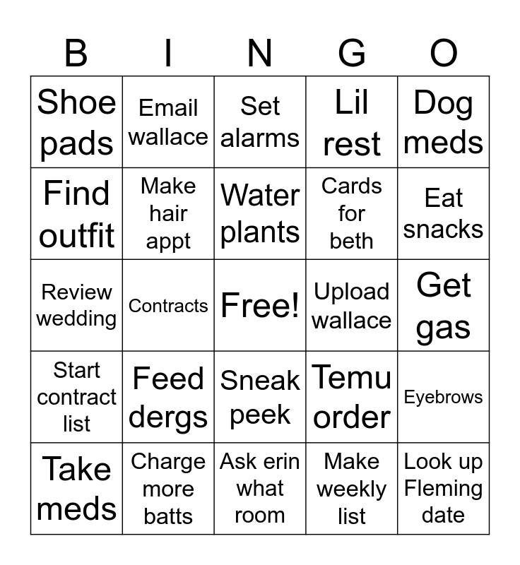 This bingo card has a free space and 24 words: Feed dergs, Charge more batts, Water plants, Take meds, Dog meds, Shoe pads, Find outfit, Email wallace, Upload wallace, Sneak peek, Cards for beth, Review wedding, Temu order, Eyebrows, Make hair appt, Make weekly list, Get gas, Set alarms, Eat snacks, Contracts, Look up Fleming date, Start contract list, Lil rest and Ask erin what room.