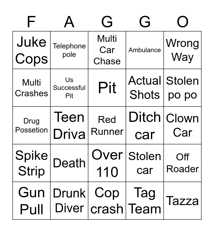 This bingo card has a free space and 24 words: Death, Drunk Diver, Pit, Gun Pull, Wrong Way, Juke Cops, Multi Crashes, Telephone pole, Ditch car, Over 110, Actual Shots, Drug Possetion, Stolen car, Off Roader, Us Successful Pit, Tag Team, Clown Car, Multi Car Chase, Stolen po po, Teen Driva, Tazza, Spike Strip, Ambulance and Cop crash.