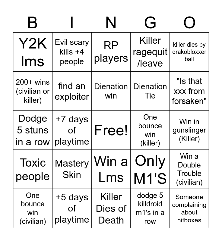 This bingo card has a free space and 24 words: Mastery Skin, +5 days of playtime, Dienation win, One bounce win (civilian), killer dies by drakobloxxer ball, Y2K lms, 200+ wins (civilian or killer), Evil scary kills +4 people, One bounce win (killer), Win a Lms, Dienation Tie, Dodge 5 stuns in a row, Only M1'S, Win a Double Trouble (civilian), find an exploiter, dodge 5 killdroid m1's in a row, Win in gunslinger (Killer), RP players, "Is that xxx from forsaken", +7 days of playtime, Someone complaining about hitboxes, Toxic people, Killer ragequit /leave and Killer Dies of Death.