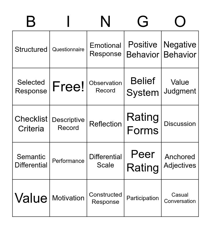 This bingo card has 73 words: Teacher Observation, Unstructured, Structured, Checklist, Rating Scale, Likert Scale, Semantic Differential, Self-Report, Peer Rating, Interview, Casual Conversation, Group Interview, Free!, Discussion, Survey, Questionnaire, Constructed Response, Selected Response, Essay, Rating Forms, Observation Record, Positive Behavior, Negative Behavior, Attitude, Value, Belief, Feeling, Trait, Behavior, Disposition, Motivation, Engagement, Learning Attitude, Open-ended, Descriptive Record, Bias-free, Efficient Procedure, Student Voice, Reflection, Feedback, Participation, Performance, Evaluation, Appraisal, Attitude Scale, Belief System, Emotional Response, Behavioral IndicatorAffective Target, Student Perception, Checklist Criteria, Peer Evaluation, Student Rating, Observation Notes, Teacher Judgment, Behavior Log, Attitude Measurement, Semantic Scale, Differential Scale, Rating Feedback, Observation Data, Monitoring, Recording, Constructive Feedback, Value Judgment, Trait Measurement, Attitude Expression, Behavioral Checklist, Likert Responses, Anchored Adjectives, Student Attitude, Observation Bias, Self-Evaluation and Peer Appraisal.
