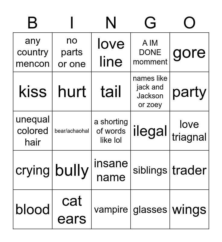 This bingo card has a free space and 24 words: bully, cat ears, tail, blood, gore, any country mencon, kiss, no parts or one, ilegal, insane name, names like jack and Jackson or zoey, unequal colored hair, siblings, trader, hurt, glasses, love triagnal, love line, party, bear/achaohal, wings, crying, A IM DONE momment and vampire.