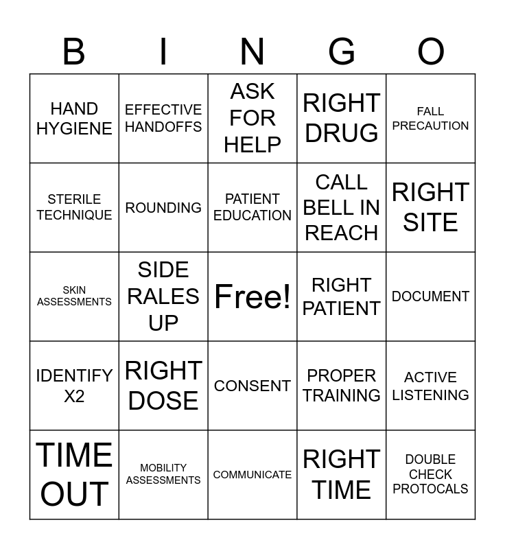 This bingo card has a free space and 24 words: RIGHT DOSE, MOBILITY ASSESSMENTS, PATIENT EDUCATION, TIME OUT, FALL PRECAUTION, HAND HYGIENE, STERILE TECHNIQUE, EFFECTIVE HANDOFFS, RIGHT PATIENT, CONSENT, CALL BELL IN REACH, SKIN ASSESSMENTS, PROPER TRAINING, ACTIVE LISTENING, ROUNDING, RIGHT TIME, DOCUMENT, ASK FOR HELP, RIGHT SITE, SIDE RALES UP, DOUBLE CHECK PROTOCALS, IDENTIFY X2, RIGHT DRUG and COMMUNICATE.