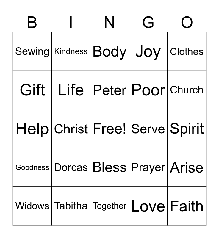 This bingo card has a free space and 24 words: Dorcas, Tabitha, Peter, Widows, Clothes, Sewing, Gift, Kindness, Serve, Bless, Poor, Help, Prayer, Arise, Life, Love, Spirit, Body, Church, Christ, Faith, Goodness, Joy and Together.