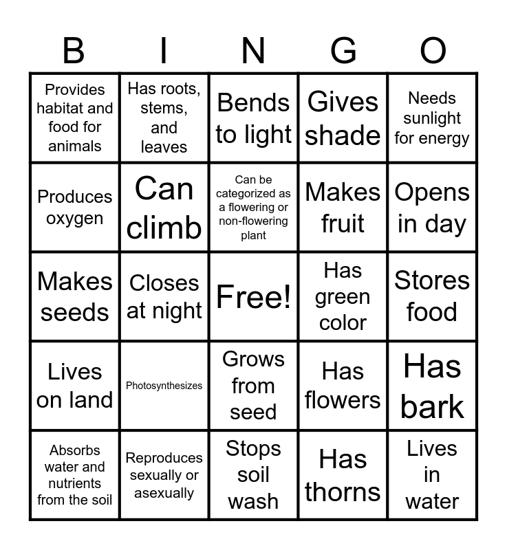 This bingo card has a free space and 24 words: Photosynthesizes, Reproduces sexually or asexually, Can be categorized as a flowering or non-flowering plant, Absorbs water and nutrients from the soil, Needs sunlight for energy, Provides habitat and food for animals, Produces oxygen, Has roots, stems, and leaves, Has green color, Grows from seed, Makes fruit, Makes seeds, Has flowers, Has bark, Can climb, Has thorns, Stores food, Bends to light, Opens in day, Closes at night, Lives in water, Lives on land, Gives shade and Stops soil wash.