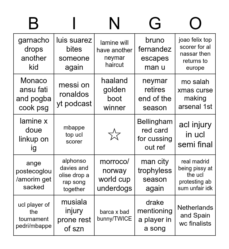This bingo card has a free space and 24 words: alphonso davies and olise drop a rap song together, musiala injury prone rest of szn, haaland golden boot winner, ucl player of the tournament pedri/mbappe, joao felix top scorer for al nassar then returns to europe, garnacho drops another kid, Monaco ansu fati and pogba cook psg, luis suarez bites someone again, Bellingham red card for cussing out ref, morroco/ norway world cup underdogs, neymar retires end of the season, lamine x doue linkup on ig, man city trophyless season again, real madrid being pissy at the ucl protesting ab sum unfair idk, messi on ronaldos yt podcast, drake mentioning a player in a song, acl injury in ucl semi final, lamine will have another neymar haircut, mo salah xmas curse making arsenal 1st, mbappe top ucl scorer, Netherlands and Spain wc finalists, ange postecoglou /amorim get sacked, bruno fernandez escapes man u and barca x bad bunny/TWICE.