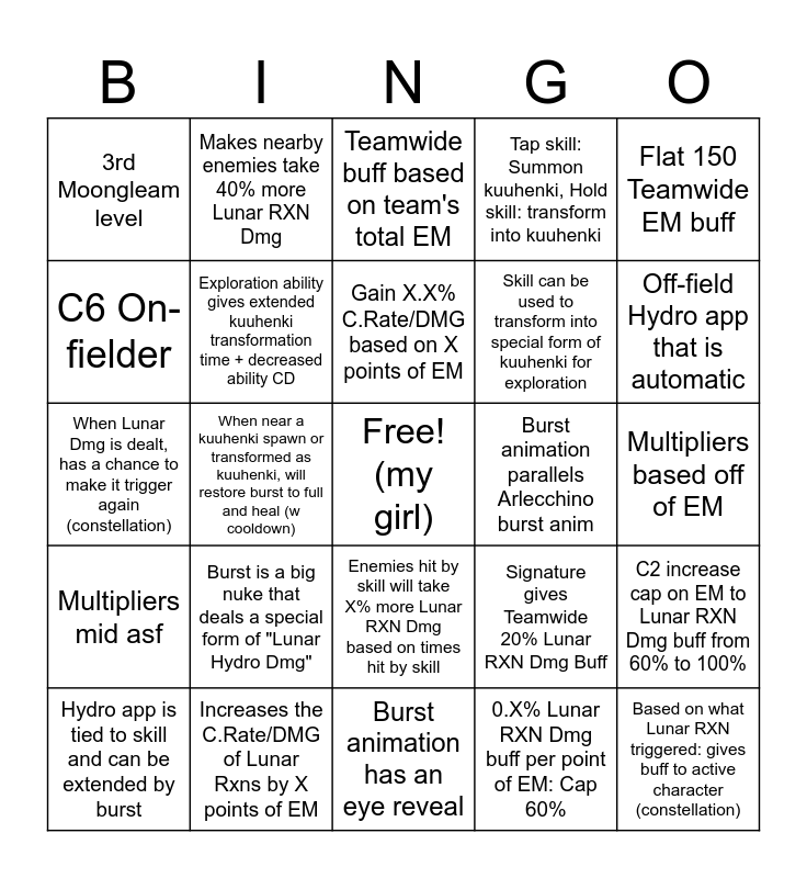 This bingo card has a free space and 24 words: Burst is a big nuke that deals a special form of "Lunar Hydro Dmg", Increases the C.Rate/DMG of Lunar Rxns by X points of EM, Gain X.X% C.Rate/DMG based on X points of EM, Hydro app is tied to skill and can be extended by burst, Flat 150 Teamwide EM buff, 3rd Moongleam level, C6 On-fielder, Makes nearby enemies take 40% more Lunar RXN Dmg, Burst animation parallels Arlecchino burst anim, Enemies hit by skill will take X% more Lunar RXN Dmg based on times hit by skill, Skill can be used to transform into special form of kuuhenki for exploration, When Lunar Dmg is dealt, has a chance to make it trigger again (constellation), Signature gives Teamwide 20% Lunar RXN Dmg Buff, C2 increase cap on EM to Lunar RXN Dmg buff from 60% to 100%, Exploration ability gives extended kuuhenki transformation time + decreased ability CD, 0.X% Lunar RXN Dmg buff per point of EM: Cap 60%, Multipliers based off of EM, Teamwide buff based on team's total EM, Off-field Hydro app that is automatic, When near a kuuhenki spawn or transformed as kuuhenki, will restore burst to full and heal (w cooldown), Based on what Lunar RXN triggered: gives buff to active character (constellation), Multipliers mid asf, Tap skill: Summon kuuhenki, Hold skill: transform into kuuhenki and Burst animation has an eye reveal.