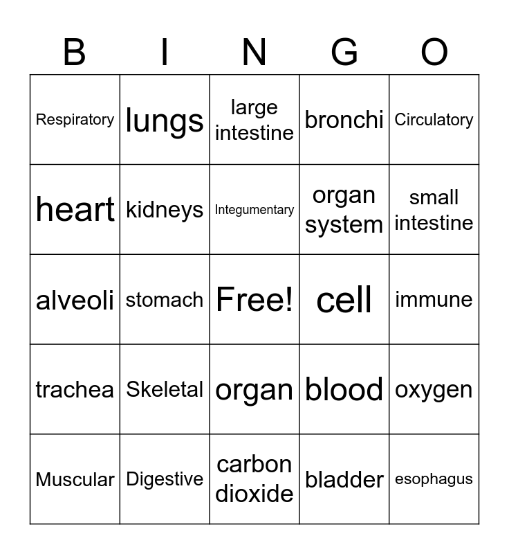 This bingo card has a free space and 24 words: Skeletal, Digestive, Integumentary, Muscular, Circulatory, Respiratory, heart, lungs, cell, organ, organ system, alveoli, blood, oxygen, kidneys, bladder, immune, large intestine, small intestine, stomach, esophagus, trachea, bronchi and carbon dioxide.