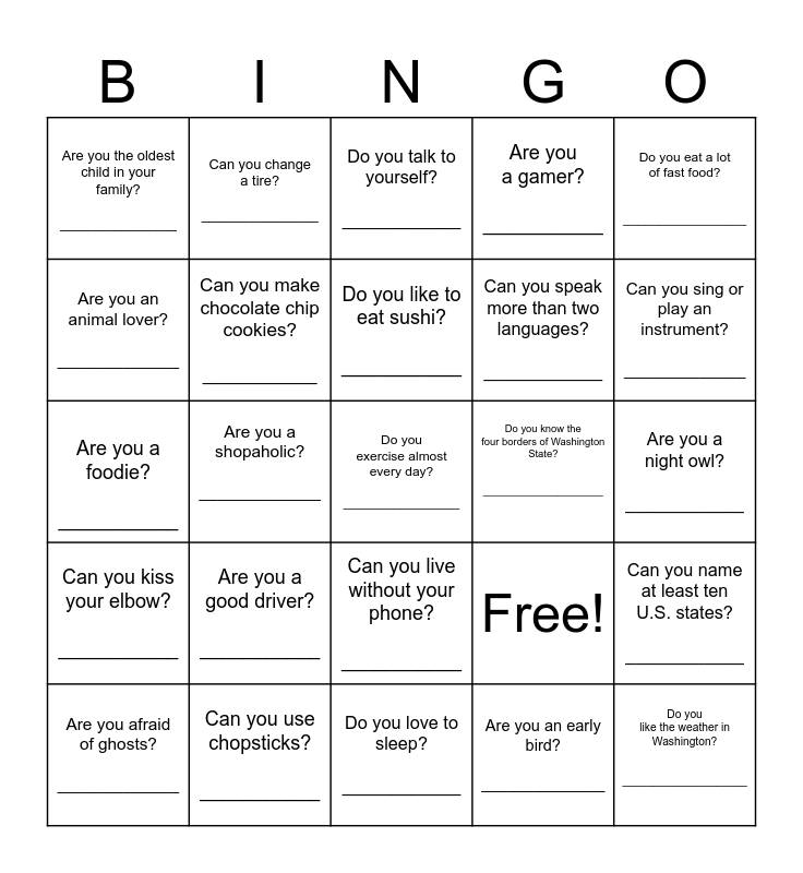 This bingo card has 25 words: Are you a good driver? ___________, Do you love to sleep? ____________, Do you like to eat sushi? ___________, Are you afraid of ghosts? _____________, Do you eat a lot of fast food? _________________, Are you the oldest child in your family? _______________, Are you an animal lover? _____________, Can you change a tire? _______________, Do you know the four borders of Washington State? _____________________, Can you live without your phone? ___________, Can you speak more than two languages? ____________, Are you a foodie? ___________, Free!, Can you name at least ten U.S. states? ____________, Can you make chocolate chip cookies? ___________, Do you like the weather in Washington? ____________________, Are you a night owl? ____________, Do you talk to yourself? ____________, Can you sing or play an instrument? _____________, Are you a shopaholic? _____________, Do you exercise almost every day? ________________, Can you use chopsticks? ___________, Can you kiss your elbow? ___________, Are you a gamer? ___________ and Are you an early bird? ______________.