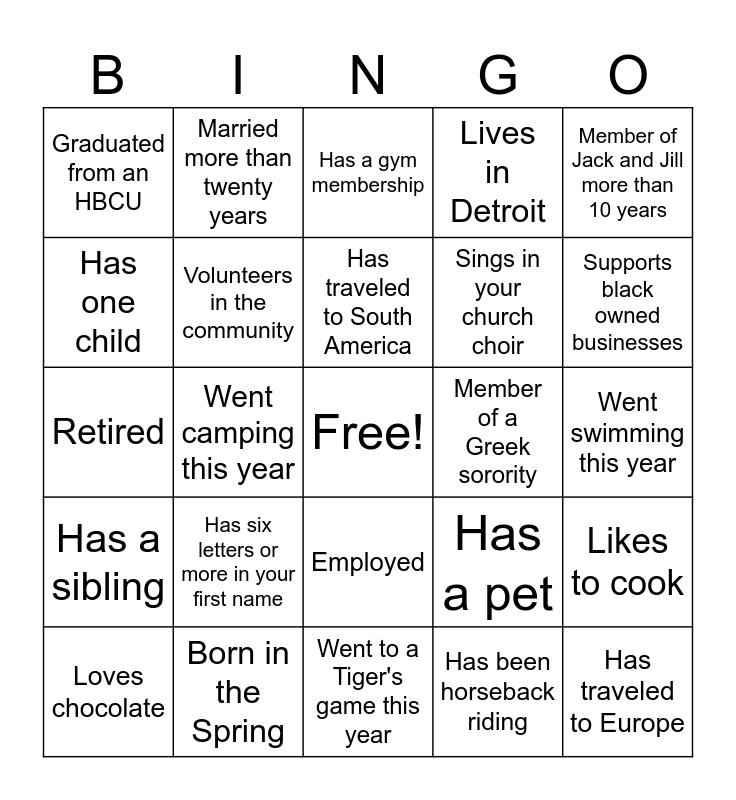 This bingo card has a free space and 24 words: Has six letters or more in your first name, Born in the Spring, Has traveled to South America, Loves chocolate, Member of Jack and Jill more than 10 years, Graduated from an HBCU, Has one child, Married more than twenty years, Member of a Greek sorority, Employed, Sings in your church choir, Retired, Has a pet, Likes to cook, Volunteers in the community, Has been horseback riding, Went swimming this year, Has a gym membership, Supports black owned businesses, Went camping this year, Has traveled to Europe, Has a sibling, Lives in Detroit and Went to a Tiger's game this year.