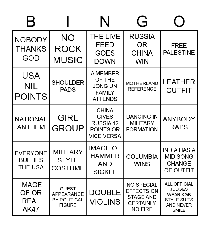 This bingo card has a free space and 24 words: MILITARY STYLE COSTUME, GUEST APPEARANCE BY POLITICAL FIGURE, A MEMBER OF THE JONG UN FAMILY ATTENDS, IMAGE OF OR REAL AK47, FREE PALESTINE, NOBODY THANKS GOD, USA NIL POINTS, NO ROCK MUSIC, DANCING IN MILITARY FORMATION, IMAGE OF HAMMER AND SICKLE, MOTHERLAND REFERENCE, NATIONAL ANTHEM, COLUMBIA WINS, INDIA HAS A MID SONG CHANGE OF OUTFIT, SHOULDER PADS, NO SPECIAL EFFECTS ON STAGE AND CERTAINLY NO FIRE, ANYBODY RAPS, THE LIVE FEED GOES DOWN, LEATHER OUTFIT, GIRL GROUP, ALL OFFICIAL JUDGES WEAR KGB STYLE SUITS AND NEVER SMILE, EVERYONE BULLIES THE USA, RUSSIA OR CHINA WIN and DOUBLE VIOLINS.