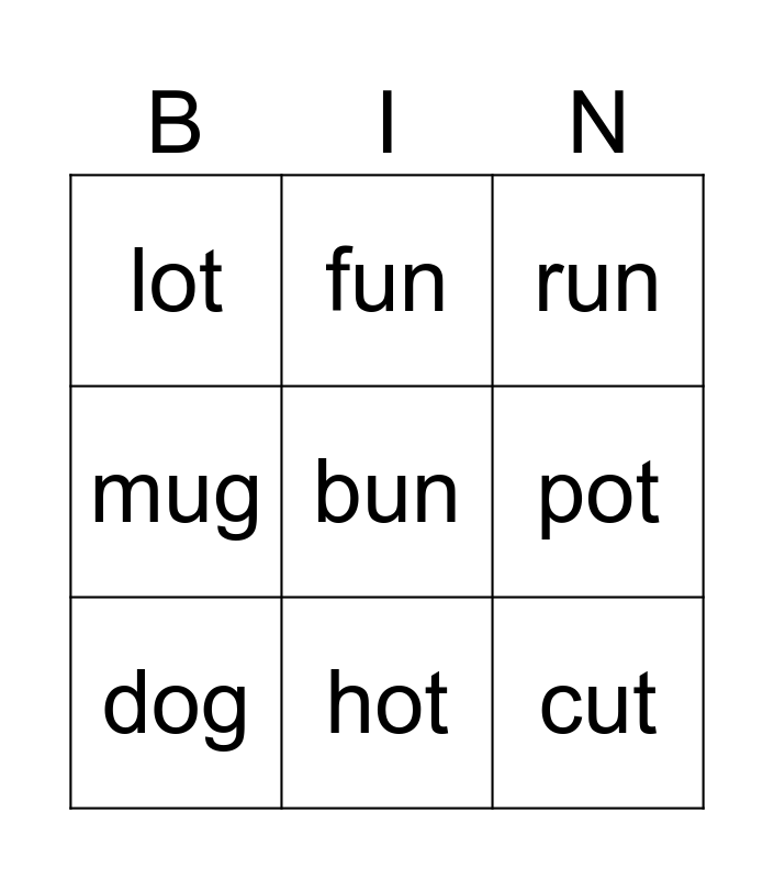 This bingo card has 9 words: dog, run, fun, mug, lot, pot, bun, cut and hot.