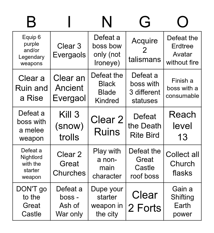 This bingo card has 53 words: Free!, Clear 2 Ruins, Clear 2 Great Encampments, Clear 2 Forts, Clear 2 Great Churches, Clear 2 Tunnels, Clear 3 Evergaols, Clear ALL Evergaols, Clear a Ruin and a Rise, Clear an Evergaol at level 1, Clear an Ancient Evergaol, Open 2 Rises, Collect all Church flasks, Defeat the Great Castle roof boss, Clear the WHOLE Great Castle in day 2, DON'T go to the Great Castle, Defeat the Black Blade Kindred, Defeat the Death Rite Bird, Defeat the Bell Bearing Hunter, Defeat the Erdtree Avatar without fire, Kill 3 (snow) trolls, Gain a Shifting Earth power, Defeat a boss with 3 different statuses, Equip 6 purple and/or Legendary weapons, Defeat a Night Boss without a reward, Defeat a boss - Ash of War only, Defeat a boss - jump attacks only, Kill the troll before dragon in the Mountain, Acquire 3 passive BOSS rewards in a row, Finish a boss with a consumable, Defeat a boss using only your Skill and Ult, Defeat a boss using a WHITE weapon, Defeat a boss after hitting it with 6 weapons, Finish a raid, Defeat 3 Great Enemies, Acquire 3 different pots, Acquire 2 talismans, Dupe your starter weapon in the city, Defeat a boss bow only (not Ironeye), Defeat the Astel in the city, Defeat 2 Demihuman Queens in the Crater, Defeat ALL the Great Enemies in the forest, Reach level 13, Have 200 000 runes before leveling up, Defeat Royal Revenant with healing only, Play with a non-main character, Defeat a boss with daggers only, Defeat a boss with a staff or seal, Defeat a boss with a melee weapon, Defeat a Nightlord with the starter weapon, Defeat a Night Boss with a WHITE weapon, Equip 4 weapons of the same type and Equip 6 weapons of different type.
