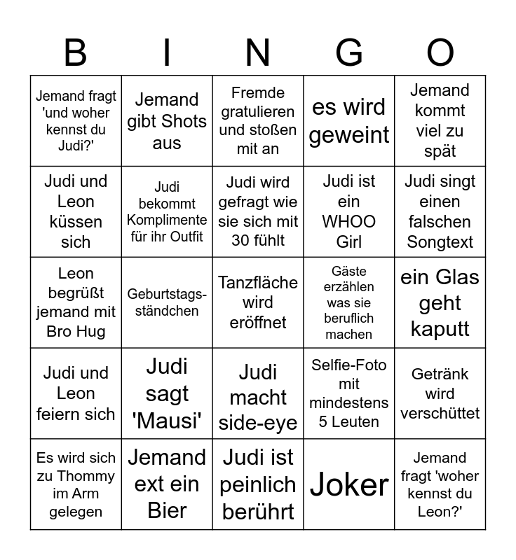 This bingo card has a free space and 24 words: Judi sagt 'Mausi', Jemand ext ein Bier, Judi wird gefragt wie sie sich mit 30 fühlt, Es wird sich zu Thommy im Arm gelegen, Jemand kommt viel zu spät, Jemand fragt 'und woher kennst du Judi?', Judi und Leon küssen sich, Jemand gibt Shots aus, Gäste erzählen was sie beruflich machen, Judi macht side-eye, Judi ist ein WHOO Girl, Leon begrüßt jemand mit Bro Hug, Selfie-Foto mit mindestens 5 Leuten, Getränk wird verschüttet, Judi bekommt Komplimente für ihr Outfit, Joker, ein Glas geht kaputt, Fremde gratulieren und stoßen mit an, Judi singt einen falschen Songtext, Geburtstags-ständchen, Jemand fragt 'woher kennst du Leon?', Judi und Leon feiern sich, es wird geweint and Judi ist peinlich berührt.
