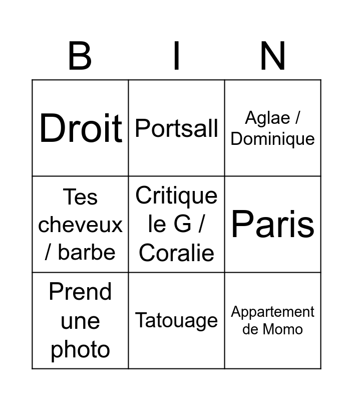 This bingo card has a free space and 8 words: Paris, Aglae / Dominique, Portsall, Prend une photo, Droit, Appartement de Momo, Tes cheveux / barbe and Tatouage.