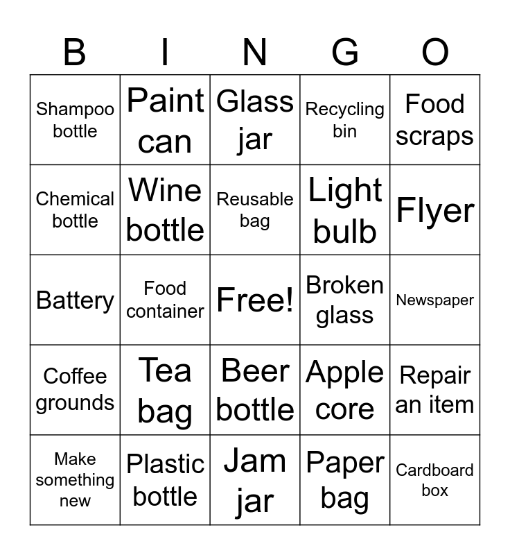 This bingo card has a free space and 30 words: Plastic bottle, Plastic bag, Food container, Yogurt cup, Shampoo bottle, Glass jar, Wine bottle, Beer bottle, Broken glass, Jam jar, Newspaper, Cardboard box, Paper bag, Notebook, Flyer, Banana peel, Apple core, Coffee grounds, Tea bag, Food scraps, Battery, Old medicine, Paint can, Light bulb, Chemical bottle, Recycling bin, Repair an item, Make something new, Reusable bag and Donate clothes.