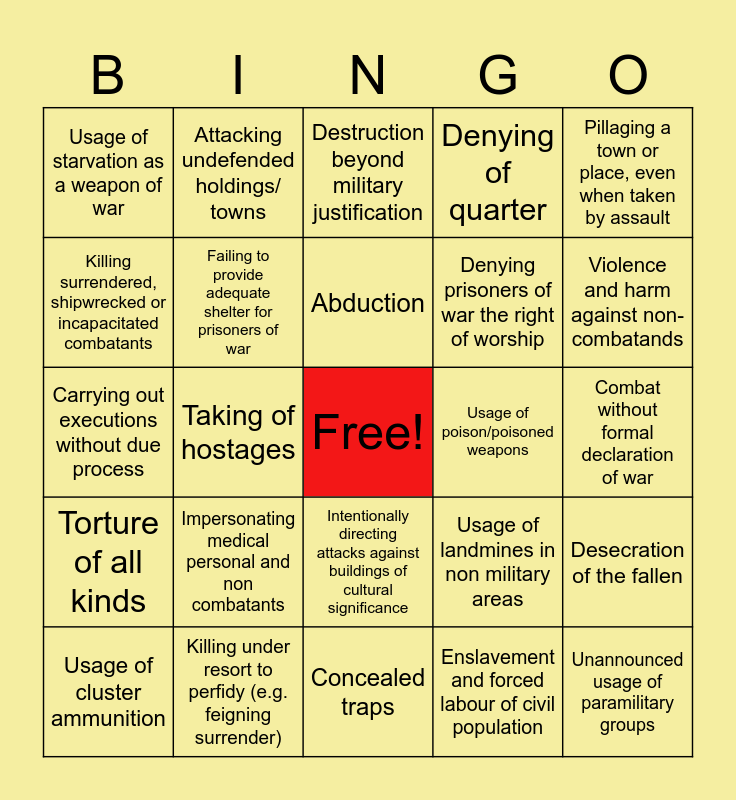 This bingo card has a free space and 29 words: Usage of cluster ammunition, Cruel and unusual punishment, Taking of hostages, Attacking of a clearly marked medical facility, Usage of starvation as a weapon of war, Destruction beyond military justification, Failing to provide adequate shelter for prisoners of war, Impersonating medical personal and non combatants, Usage of poison/poisoned weapons, Killing under resort to perfidy (e.g. feigning surrender), Combat without formal declaration of war, Unannounced usage of paramilitary groups, Concealed traps, Enslavement and forced labour of civil population, Violence and harm against non-combatands, Intended long term devastation of the environment, Intentionally directing attacks against buildings of cultural significance, Torture of all kinds, Pillaging a town or place, even when taken by assault, Carrying out executions without due process, Usage of landmines in non military areas, Misleading road signs, Denying prisoners of war the right of worship, Killing surrendered, shipwrecked or incapacitated combatants, Denying of quarter, Attacking undefended holdings/ towns, Desecration of the fallen, Abduction and Destruction of essential infrastructure.