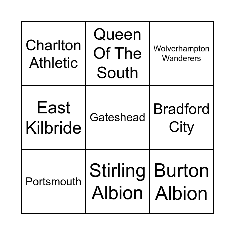 This bingo card has 84 words: West Ham United, Crystal Palace, Wolverhampton Wanderers, Leeds United, Blackburn Rovers, Ipswich Town, Derby County, Preston North End, Hull City, Southampton, Norwich City, Wrexham, Portsmouth, Sheffield Wednesday, Sheffield United, Charlton Athletic, Cardiff City, Bradford City, Doncaster Rovers, AFC Wimbledon, Huddersfield Town, Burton Albion, Plymouth Argyle, Peterborough United, Port Vale, Mansfield Town, Reading, Leyton Orient, Barnet, Grimsby Town, Dundee, Livingston, Aberdeen, Motherwell, Airdrieonians, Raith Rovers, Arbroath, Morton, Ross County, Queen’s Park, Alloa Athletic, Cove Rangers, East Fife, Montrose, Kelty Hearts, Hamilton Academical, Queen Of The South, Inverness CT, Stenhousemuir, Peterhead, Clyde, Edinburgh City, East Kilbride, Dumbarton, Forfar Athletic, Annan Athletic, Spartans, Stirling Albion, Stranraer, Elgin City, Aldershot Town, Hartlepool United, Altrincham, Carlisle United, Boston United, Boreham Wood, Eastleigh, Braintree Town, Gateshead, FC Halifax, Morecambe, Wealdstone, Scunthorpe United, Truro City, Tamworth, Yeovil Town, Woking, Forest Green Rovers, York City, Solihull Moors, Burnley, Tottenham, Brighton and Notts Forest.