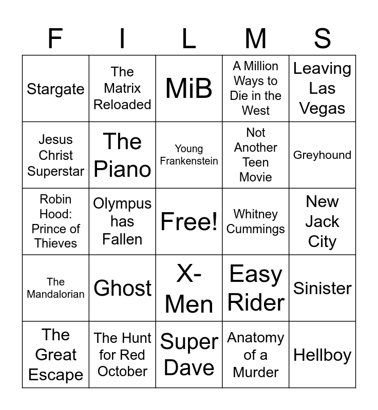This bingo card has a free space and 64 words: Beetlejuice, Last Action Hero, Avengers: Age of Ultron, Sinister, Taken, Sin City, The Matrix Reloaded, Lifeforce, Young Frankenstein, Cool Hand Luke, X-Men, The Day the Earth Stood Still, New Jack City, Leaving Las Vegas, The Labyrinth, Jesus Christ Superstar, Olympus has Fallen, Stargate, A Man Apart, Not Another Teen Movie, Ghost, The Mandalorian, A Million Ways to Die in the West, The Pelican Brief, Home Alone, Days of Thunder, Tucker & Dale vs Evil, Oz The Great and Powerful, Escape Room, Wanted, Loki, Scary Movie, In the Line of Fire, Aladdin, Greyhound, The Great Escape, Can't Fight the Moonlight, Anatomy of a Murder, Adventures of Superman, The Piano, Robin Hood: Prince of Thieves, Whitney Cummings, Born on the Fourth of July, Street Fighter, A League of their Own, Hellboy, The Hunt for Red October, Basic Instinct, Easy Rider, Wyatt Earp, Bird on a Wire, Batman, Super Dave, Enemy, 500 Days of Summer, Double Indemnity, MiB, Married to the Mob, Monty Python, American Psycho, Supergirl, Legends of the Fall, Remember the Alamo and Constantine.