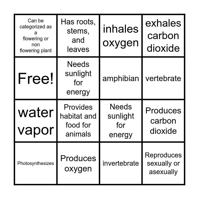 This bingo card has 16 words: Produces oxygen, Produces carbon dioxide, inhales oxygen, Can be categorized as a flowering or non flowering plant, water vapor, Has roots, stems, and leaves, Needs sunlight for energy, invertebrate, Free!, Needs sunlight for energy, Photosynthesizes, exhales carbon dioxide, Provides habitat and food for animals, vertebrate, amphibian and Reproduces sexually or asexually.