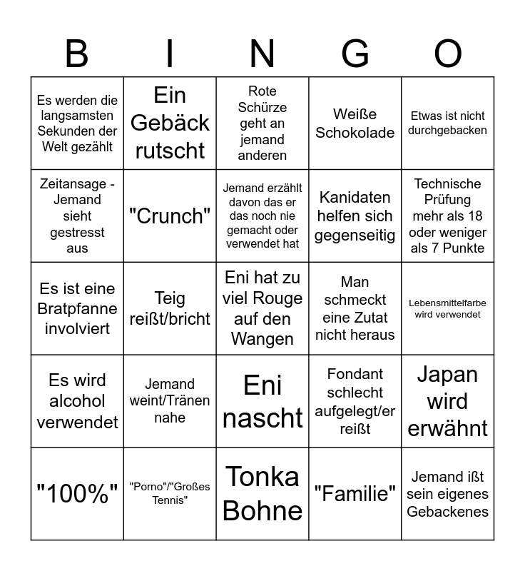 This bingo card has a free space and 24 words: Jemand weint/Tränen nahe, "Porno"/"Großes Tennis", Jemand erzählt davon das er das noch nie gemacht oder verwendet hat, "100%", Etwas ist nicht durchgebacken, Es werden die langsamsten Sekunden der Welt gezählt, Zeitansage - Jemand sieht gestresst aus, Ein Gebäck rutscht, Man schmeckt eine Zutat nicht heraus, Eni nascht, Kanidaten helfen sich gegenseitig, Es ist eine Bratpfanne involviert, Fondant schlecht aufgelegt/er reißt, Japan wird erwähnt, "Crunch", "Familie", Lebensmittelfarbe wird verwendet, Rote Schürze geht an jemand anderen, Technische Prüfung mehr als 18 oder weniger als 7 Punkte, Teig reißt/bricht, Jemand ißt sein eigenes Gebackenes, Es wird alcohol verwendet, Weiße Schokolade and Tonka Bohne.