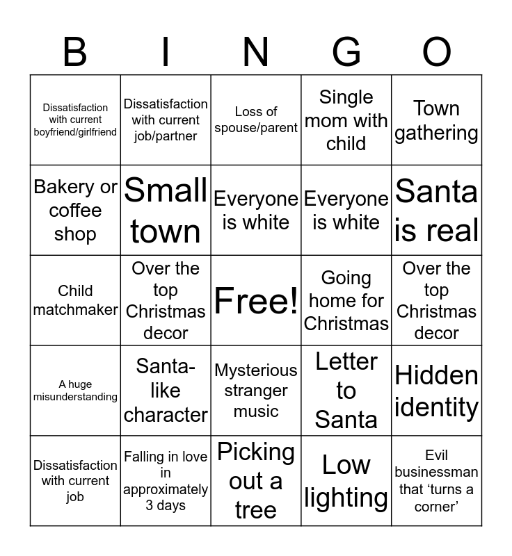 ⚠ This card has duplicate items: Loss of spouse/parent (2), Single man - dreamy, gentle, sensitive (2), Author or healthcare worker (2), Fancy house despite $ troubles (2), Sweaters (2), Scarves (2), Broaches (2), Love triangle (2), Letter to Santa (2), Santa is real (2), Everyone is white (2), Bakery or coffee shop (2), Failing business with time limit (2), Over the top Christmas decor (2), Low lighting (2), Evil businessman that ‘turns a corner’ (2), Sharing of lifelong dreams (2), Town gathering (2), Child matchmaker (2), Small town (2)