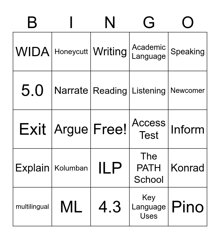 This bingo card has a free space and 24 words: Kolumban, ML, Reading, multilingual, Speaking, WIDA, 5.0, Honeycutt, Access Test, ILP, Listening, Exit, The PATH School, Konrad, Narrate, Key Language Uses, Inform, Writing, Newcomer, Argue, Pino, Explain, Academic Language and 4.3.
