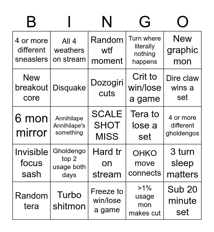 This bingo card has a free space and 24 words: Gholdengo top 2 usage both days, Turbo shitmon, Dozogiri cuts, Random tera, New graphic mon, 4 or more different sneaslers, New breakout core, All 4 weathers on stream, Tera to lose a set, Hard tr on stream, Crit to win/lose a game, 6 mon mirror, OHKO move connects, 3 turn sleep matters, Disquake, >1% usage mon makes cut, 4 or more different gholdengos, Random wtf moment, Dire claw wins a set, Annihilape Annihilape's something, Sub 20 minute set, Invisible focus sash, Turn where literally nothing happens and Freeze to win/lose a game.