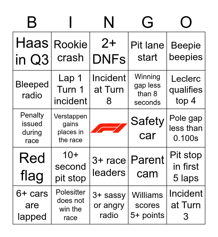 This bingo card has a free space and 27 words: Parent cam, Piastri Podium™️, Winning gap less than 8 seconds, 3+ sassy or angry radio, Bleeped radio, 2+ DNFs, Rookie crash, Red flag, Safety car, Pit stop in first 5 laps, Penalty issued during race, Pit lane start, 6+ cars are lapped, Polesitter does not win the race, Leclerc qualifies top 4, Lawson gains places on opening lap, Lap 1 Turn 1 incident, Incident at Turn 8, 10+ second pit stop, Haas in Q3, Pole gap less than 0.100s, Williams scores 5+ points, Verstappen gains places in the race, Incident at Turn 3, 3+ race leaders, Beepie beepies and HAD GAS or HAD HAM in session result.