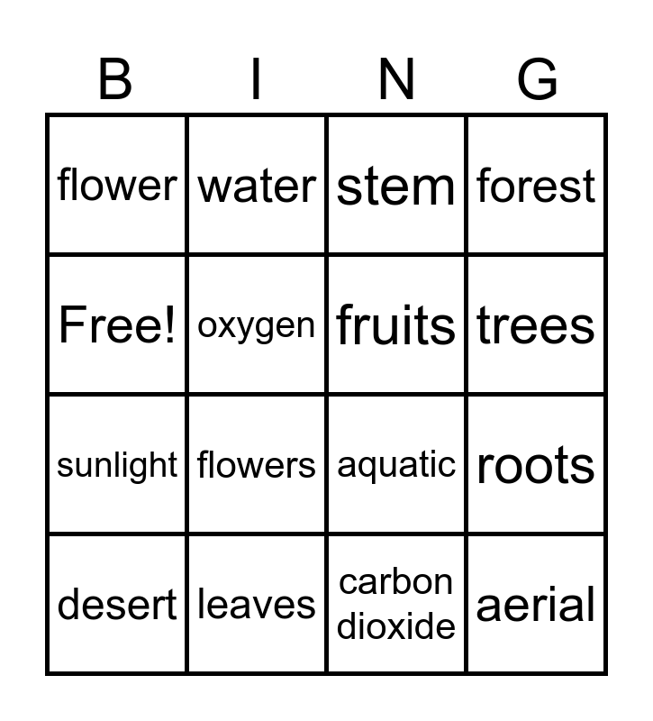 This bingo card has 16 words: leaves, roots, stem, flower, sunlight, water, aquatic, carbon dioxide, Free!, oxygen, desert, forest, flowers, trees, fruits and aerial.