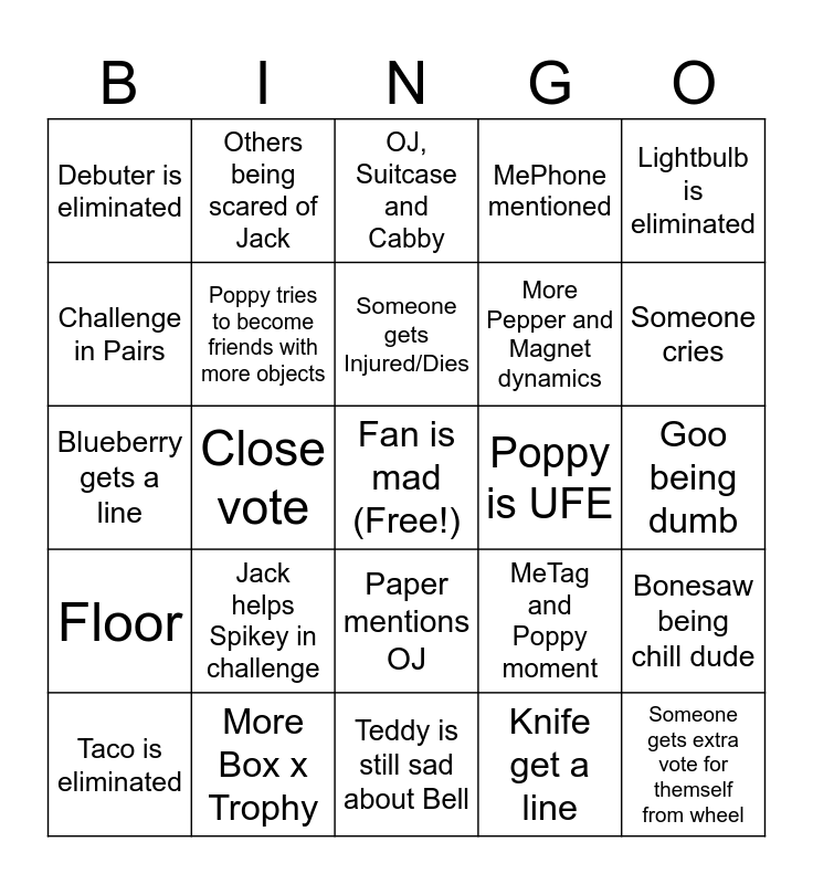 This bingo card has a free space and 24 words: Jack helps Spikey in challenge, More Box x Trophy, Someone gets Injured/Dies, Taco is eliminated, Lightbulb is eliminated, Debuter is eliminated, Challenge in Pairs, Others being scared of Jack, Poppy is UFE, Paper mentions OJ, More Pepper and Magnet dynamics, Blueberry gets a line, MeTag and Poppy moment, Bonesaw being chill dude, Poppy tries to become friends with more objects, Knife get a line, Goo being dumb, OJ, Suitcase and Cabby, Someone cries, Close vote, Someone gets extra vote for themself from wheel, Floor, MePhone mentioned and Teddy is still sad about Bell.