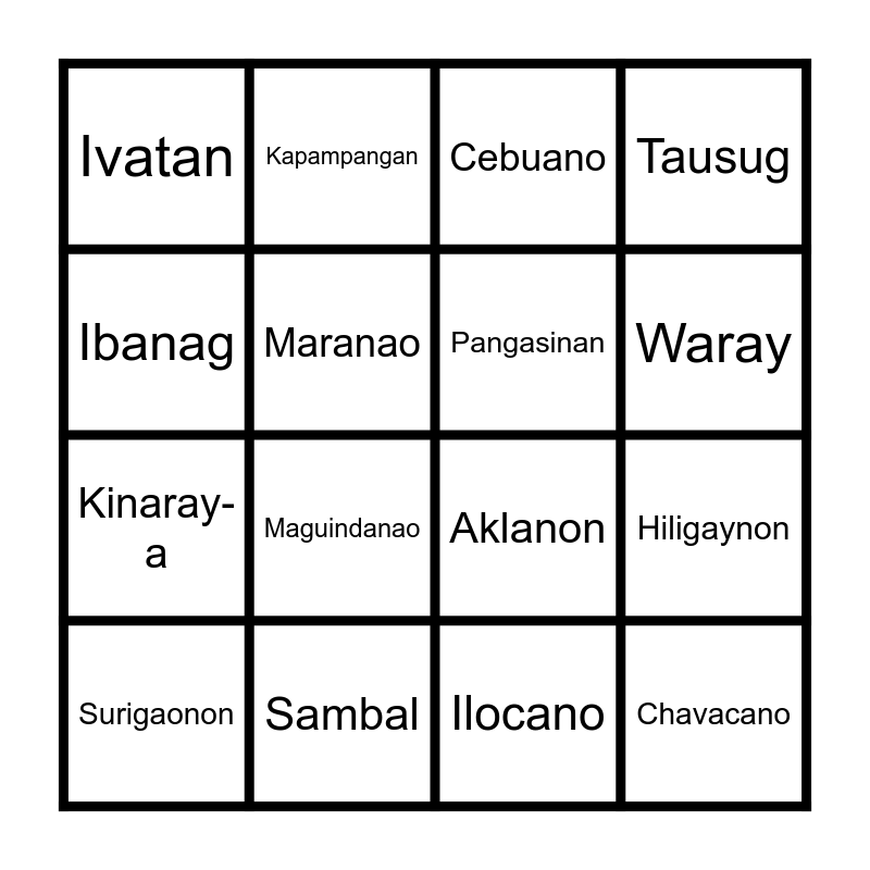This bingo card has 19 words: Aklanon, Bikol, Cebuano, Chavacano, Hiligaynon, Ibanag, Ilocano, Ivatan, Kapampangan, Kinaray-a, Maguindanao, Maranao, Pangasinan, Sambal, Surigaonon, Tagalog, Tausug, Waray and Yakan.