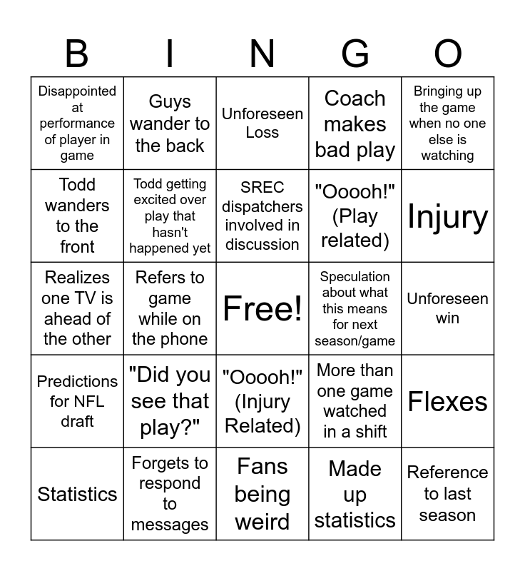 This bingo card has a free space and 24 words: "Did you see that play?", Forgets to respond to messages, SREC dispatchers involved in discussion, Statistics, Bringing up the game when no one else is watching, Disappointed at performance of player in game, Todd wanders to the front, Guys wander to the back, Speculation about what this means for next season/game, "Ooooh!" (Injury Related), "Ooooh!"(Play related), Realizes one TV is ahead of the other, More than one game watched in a shift, Flexes, Todd getting excited over play that hasn't happened yet, Made up statistics, Unforeseen win, Unforeseen Loss, Injury, Refers to game while on the phone, Reference to last season, Predictions for NFL draft, Coach makes bad play and Fans being weird.