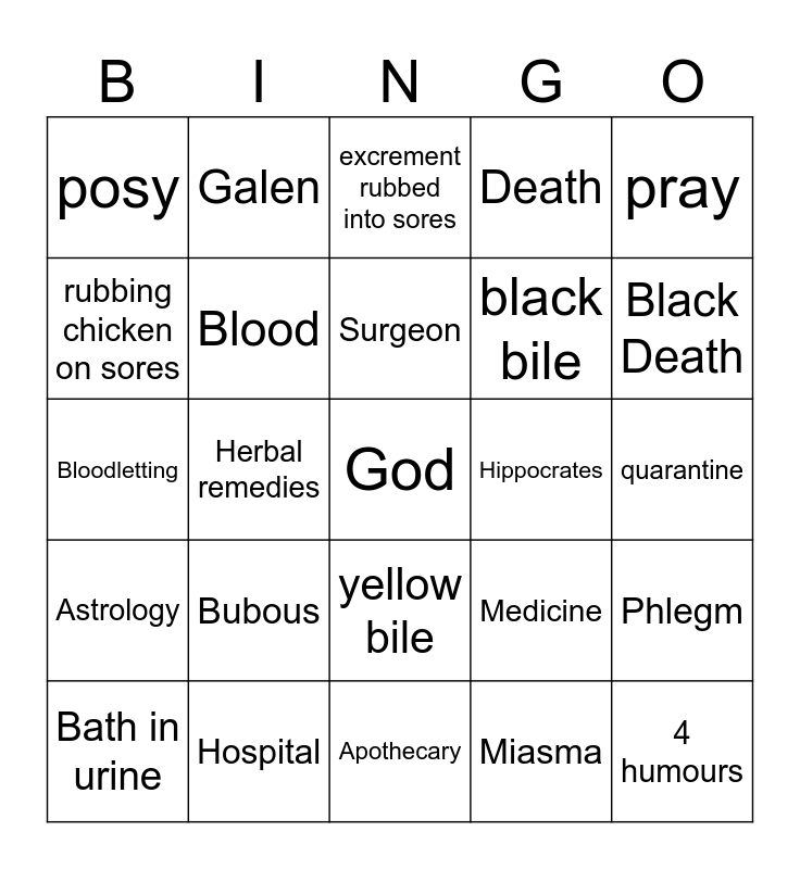 This bingo card has 25 words: Bubous, Apothecary, Surgeon, Bath in urine, pray, posy, rubbing chicken on sores, Galen, Hippocrates, yellow bile, black bile, Bloodletting, Medicine, Phlegm, Blood, 4 humours, quarantine, excrement rubbed into sores, Black Death, Herbal remedies, God, Hospital, Astrology, Death and Miasma.